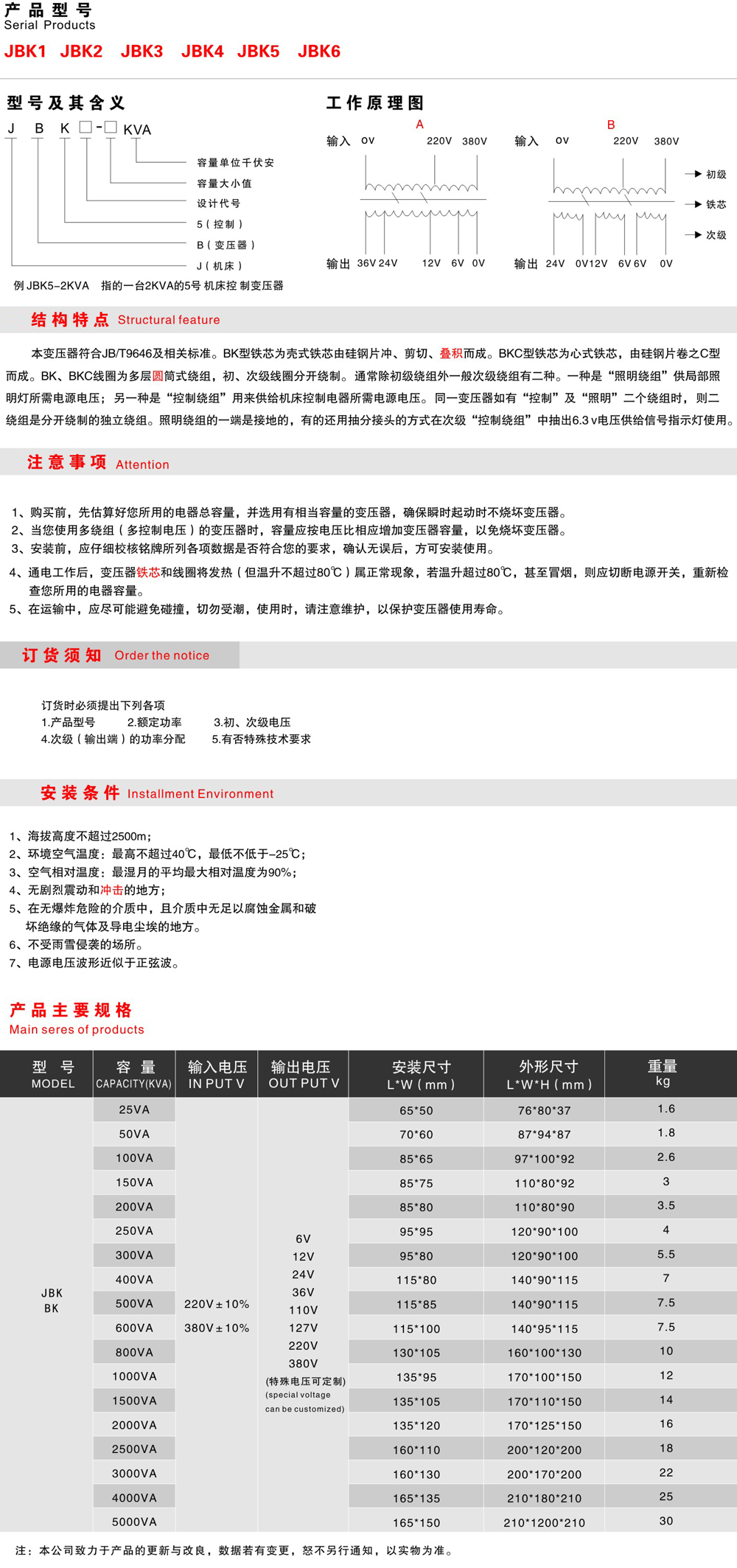 JBK/BK系列單個控制變壓器經(jīng)過臺科多年來進(jìn)一步吸收國 內(nèi)外同類產(chǎn)品的優(yōu)點(diǎn),采用先進(jìn)工藝和嚴(yán)謹(jǐn)設(shè)計(jì)進(jìn)行制造,并優(yōu)選國外先進(jìn) 的接線端子,具有性能優(yōu)良、工作可靠、耗能低、體積小、接線安全、適用性廣等特點(diǎn),是一種理想的變壓電源。 適用于50--60Hz,額定電源電壓不超過1000V的交流電路中,作為機(jī)床和機(jī)械設(shè)備的控制電源,工作照明及信號燈電源;也可作為小型動 力電源作用。