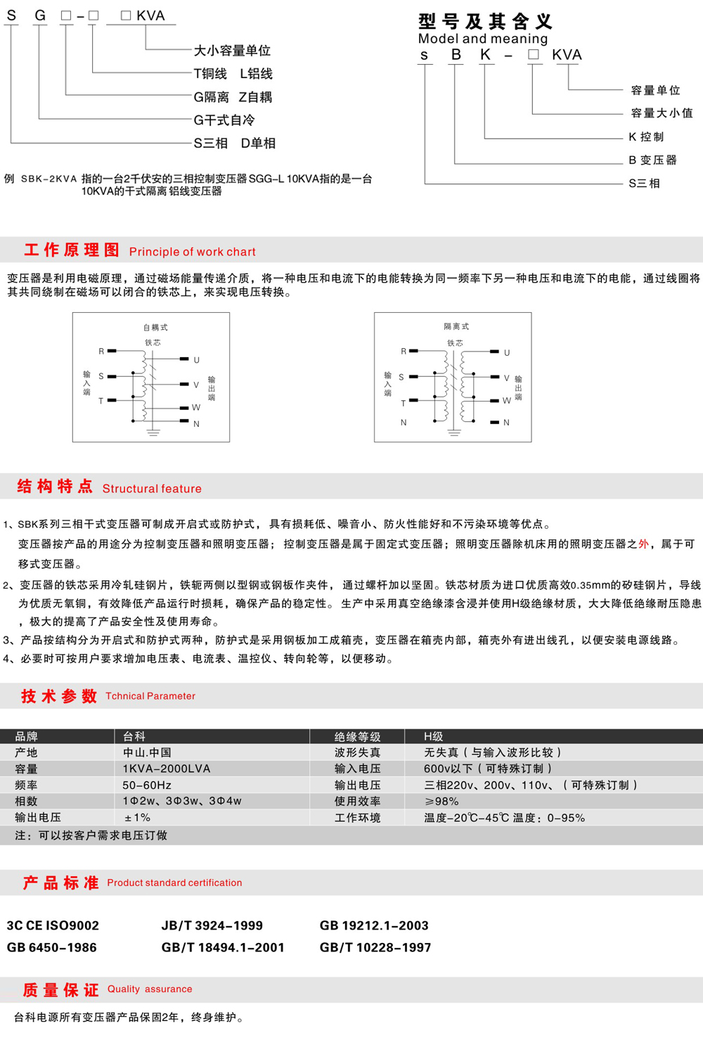 SBK/SG系列三相干式變壓器經(jīng)過臺科公司多年的研發(fā)和制造銷售經(jīng)驗(yàn),將變壓器從原材料、工藝都已經(jīng)做了的權(quán)威分析和優(yōu)化,使 我們生產(chǎn)的變壓器比同行業(yè)的噪音低、損耗低、壓降小、效率更高更穩(wěn)定。本系列產(chǎn)品適用于交流50Hz~ 60Hz,電壓660V以下的電路中, 廣泛用于進(jìn)口精密機(jī)械設(shè)備、多軸自動車床、彈簧機(jī)械、注塑機(jī)械、機(jī)械電子設(shè)備、醫(yī)療設(shè)備、整流裝置,照明等。